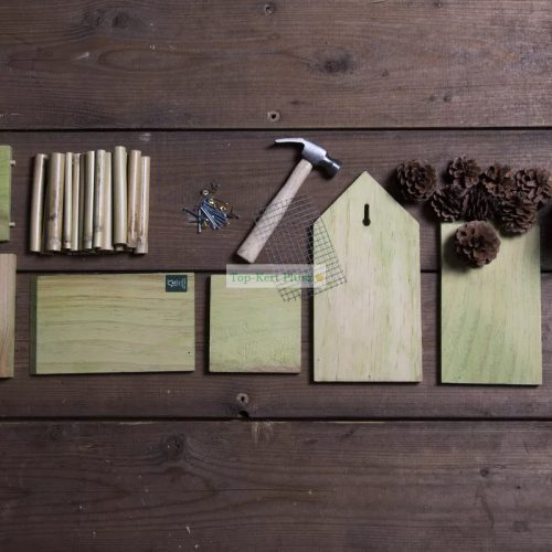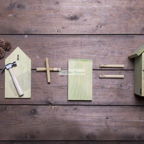 Összeszerelhető madárház. A szett tartalmazza a ház elemeit (oldalfalak, tető, alja), melyek zöldre vannak pácolva, valamint egy kis kalapácsot, szögeket, ragasztót az összeszereléshez. A madárházat kompletten össze lehet szerelni szögekkel, mi azonban tanácsoljuk, hogy egy kicsit ragasszuk össze a részeket a dobozban található faragasztóval is. Ne szögezzük oda az alját, hogy időnként tisztítani lehessen. A madárház alapvetően a cinegéknek lett tervezve. Rajta kívül lakóként vagy látogatóként számíthatunk kék cinegére, mezei verébre és kormos légykapóra is. A legjobb ötlet a madárház elhelyezésére egy szabad és valamennyire védett és nyugodt hely. Ne rakjuk tűző napra vagy olyan helyre, ahol éri az eső vagy bármilyen akadály, ami gátolja a madarak hozzáférését. Ősz a legjobb időszak a madárház kitisztítására, hiszen a téli időszakban a madarak különösen keresik a menedéket a hideg idő elől menekülve.